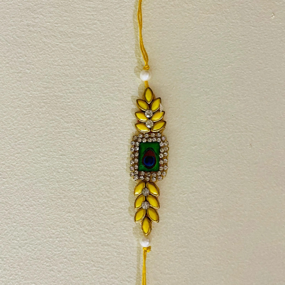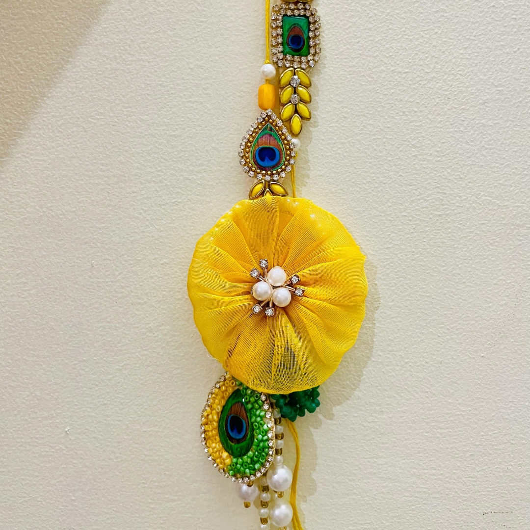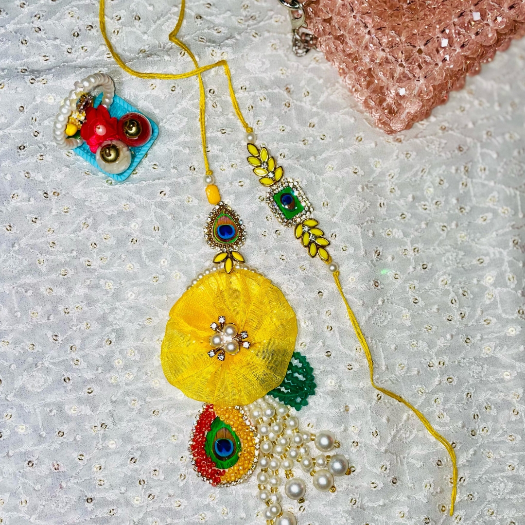 Bhaiya Bhabhi Yellow flower Assorted Rakhi Set (Male Rakhi, Female Rakhi, Roli & Rice Basket)