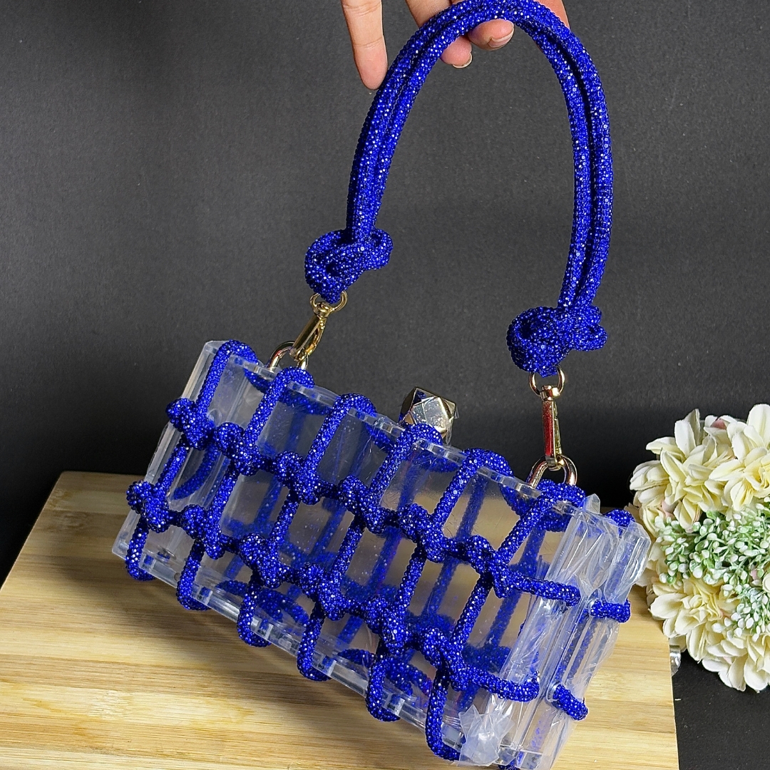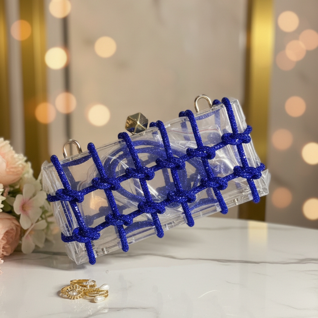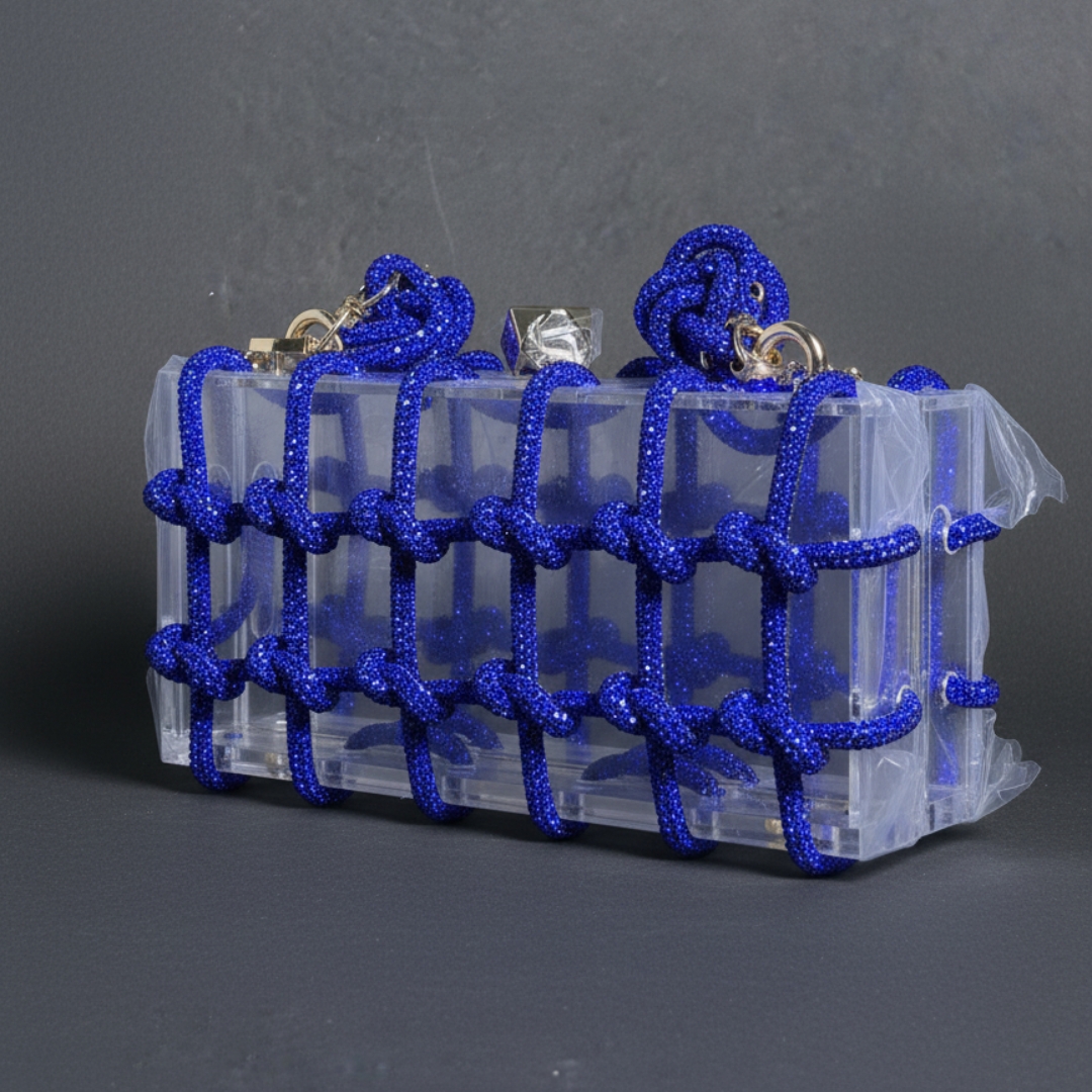 Upgrade your style with this Transparent Blue Knot Designer Handbag for Women, crafted for those who love bold, contemporary fashion. The bag features a clear structured acrylic body wrapped in striking blue textured knot detailing, giving it a high-fashion, runway-inspired look.